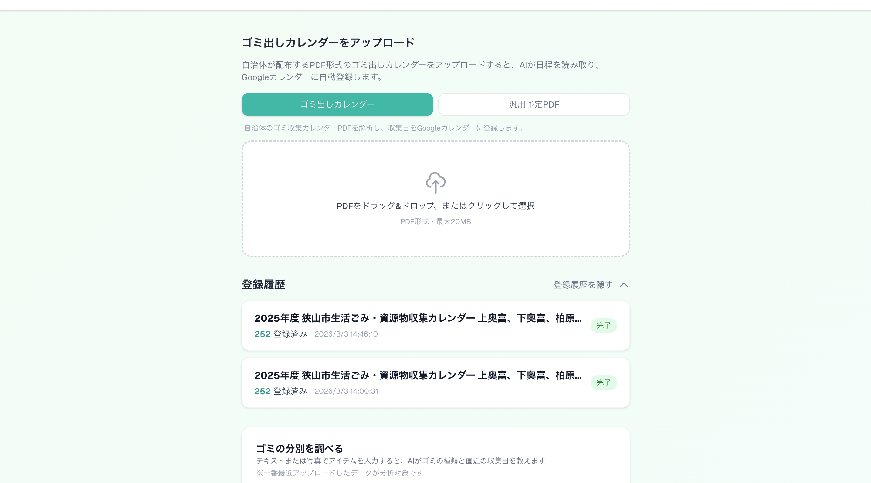 「PDFを読み込ませるだけ」というシンプルなUI(ユーザーインターフェース)の裏には、複雑なフォーマットを正確に読み解く高度な解析技術が隠されています。 手作業での入力ミスや、ゴミの出し忘れによるストレスから解放され、より快適な毎日を送るために、ぜひ一度『ゴミカレ』の魔法のような自動登録を体験してみてください。